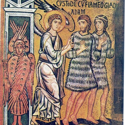 [Ψηφιδωτὸν ἐκ Παλέρμου Σικελίας, μέσα ΙΒ΄ αἰῶνος: emisit Adam de paradiso Deus et posuit cherup costudem cum flameo gladio = ἐξέβαλεν Ἀδὰμ ἐκ παραδείσου Θεὸς καὶ ἔταξε χερουβὶμ μετὰ φλογίνης ῥομφαίας.]